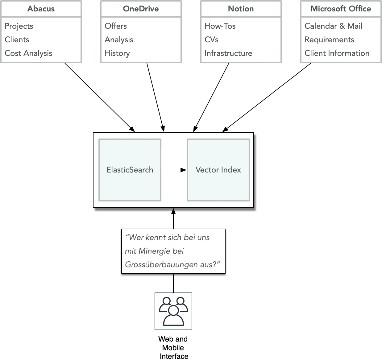 Eine solche Lösung ist im Allgemeinen kein Chatbot - es fühlt sich an wie eine intelligente Suche. Und das macht die Archive unserer Kunden zu einer Wissensbasis, und die Firma zu einer lernenden Organisation.